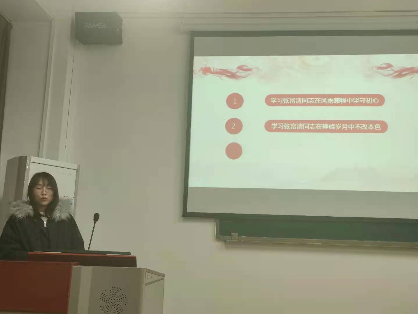 孙晔以《事了拂衣去,深藏功与名——以张富清同志为榜样,永葆共产党人的初心本色》为题,向大家生动讲述了张福清同志为党为民、无私奉献的生平,使大家深受感动,同时孙晔同学还深入讲述了张富清同志的精神,号召我们青年应该用榜样的力量涵养“初心”,不忘初心,牢记使命。