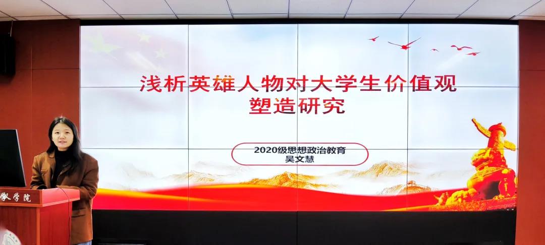 吴文慧分享的主题为《英雄人物对大学生价值观的塑造》,她以电视剧《功勋》为切入点,介绍了首批“共和国勋章”获得者们的英雄事迹,从中凝练出了英雄精神的当代意义与价值。她鼓励同学们应自觉学习英雄故事,主动将个人的发展融入社会发展的历程之中。