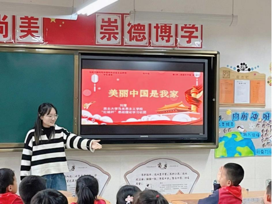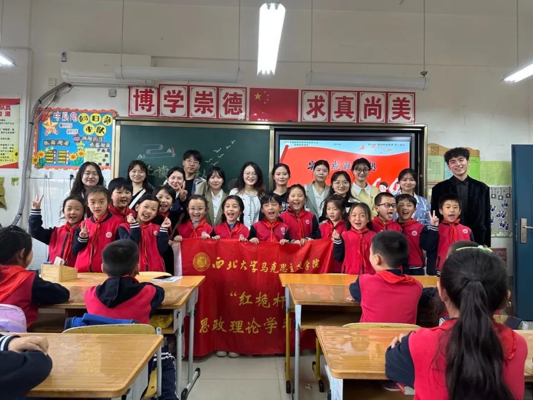 4月14日,我院“红桅杆”思政理论学习社团在西北大学附属小学,以《习近平新时代中国特色社会主义思想学生读本》(小学低年级)为主要内容,为二年级的小学生上思政课。主讲人分别是来自21级和22级的马克思主义基本原理、思想政治教育、马克思主义中国化研究与中国近现代史基本问题研究专业的12位硕士研究生。