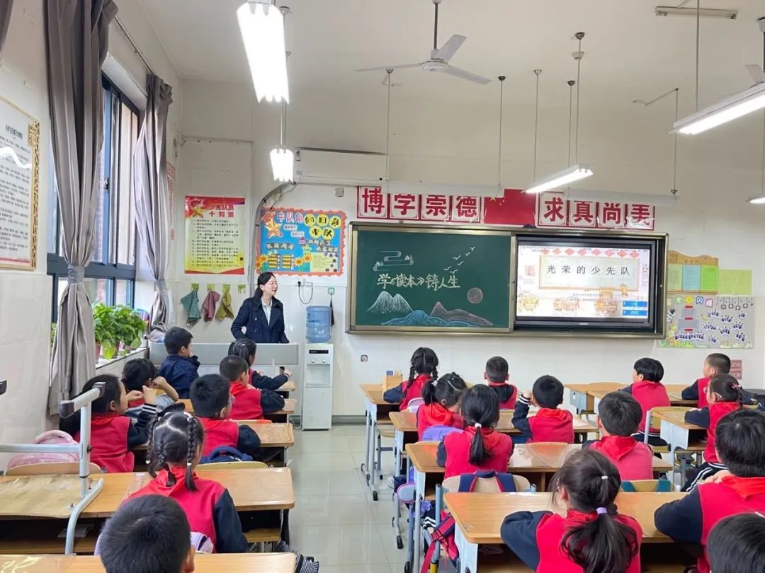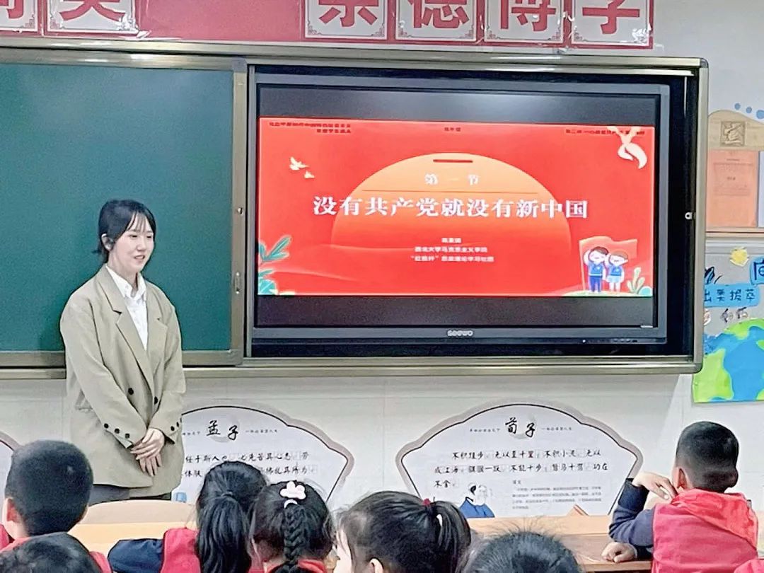 高美娟以《没有共产党就没有新中国》为主题,对中国共产党的成立和新中国的建立做了讲解,并帮助同学们理解了国旗和党旗的含义,更加深入地认识了党和国家的关系。