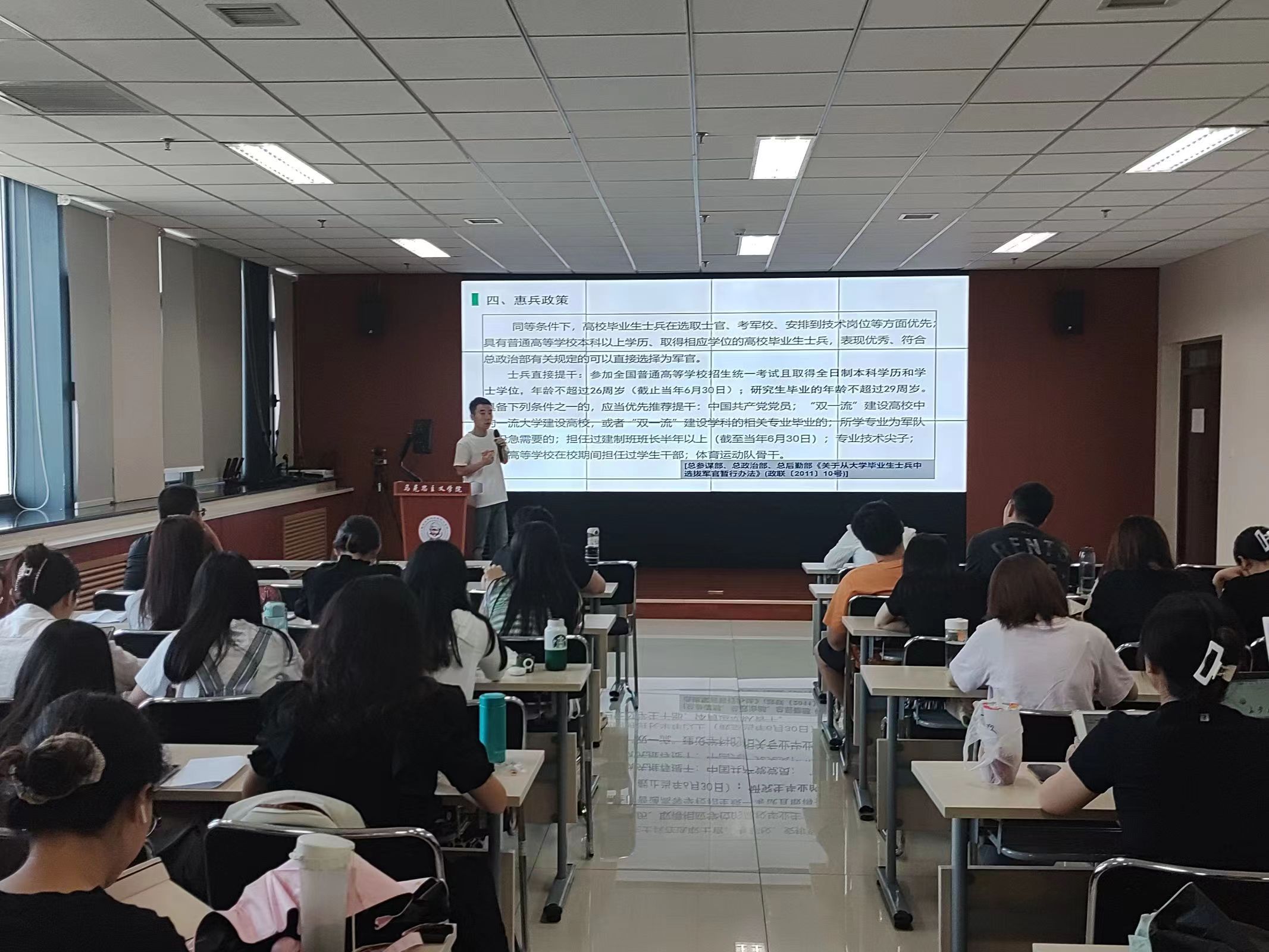 2023年6月13日下午,马克思主义学院开展“执笔为戈,筑梦军营”征兵政策宣讲会。宣讲会由我院退伍大学生士兵、2022级硕士研究生刘志晨主持。