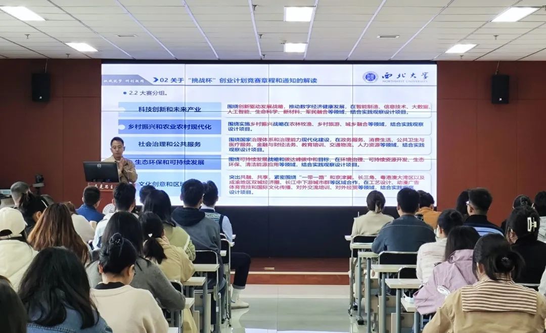 李晓杰以“挑战筑梦,科创报国”为主题,首先向同学们介绍了“挑战杯”的各种类型,同时对挑战杯竞赛的章程和通知进行了重点解读,并以“预制菜”为例,强调参赛作品需要围绕社会价值、实践过程、创新意义、发展前景、团队协作等五方面展开。最后,他向同学们展示了我校学生挑战杯往届优秀作品,鼓励同学们要多关注社会民生的热点、痛点、和难点。