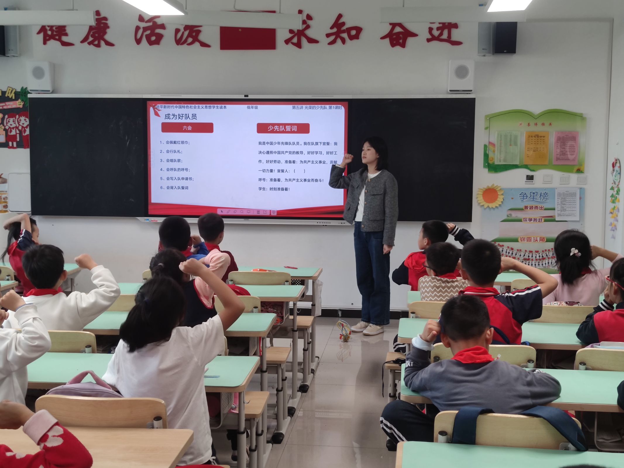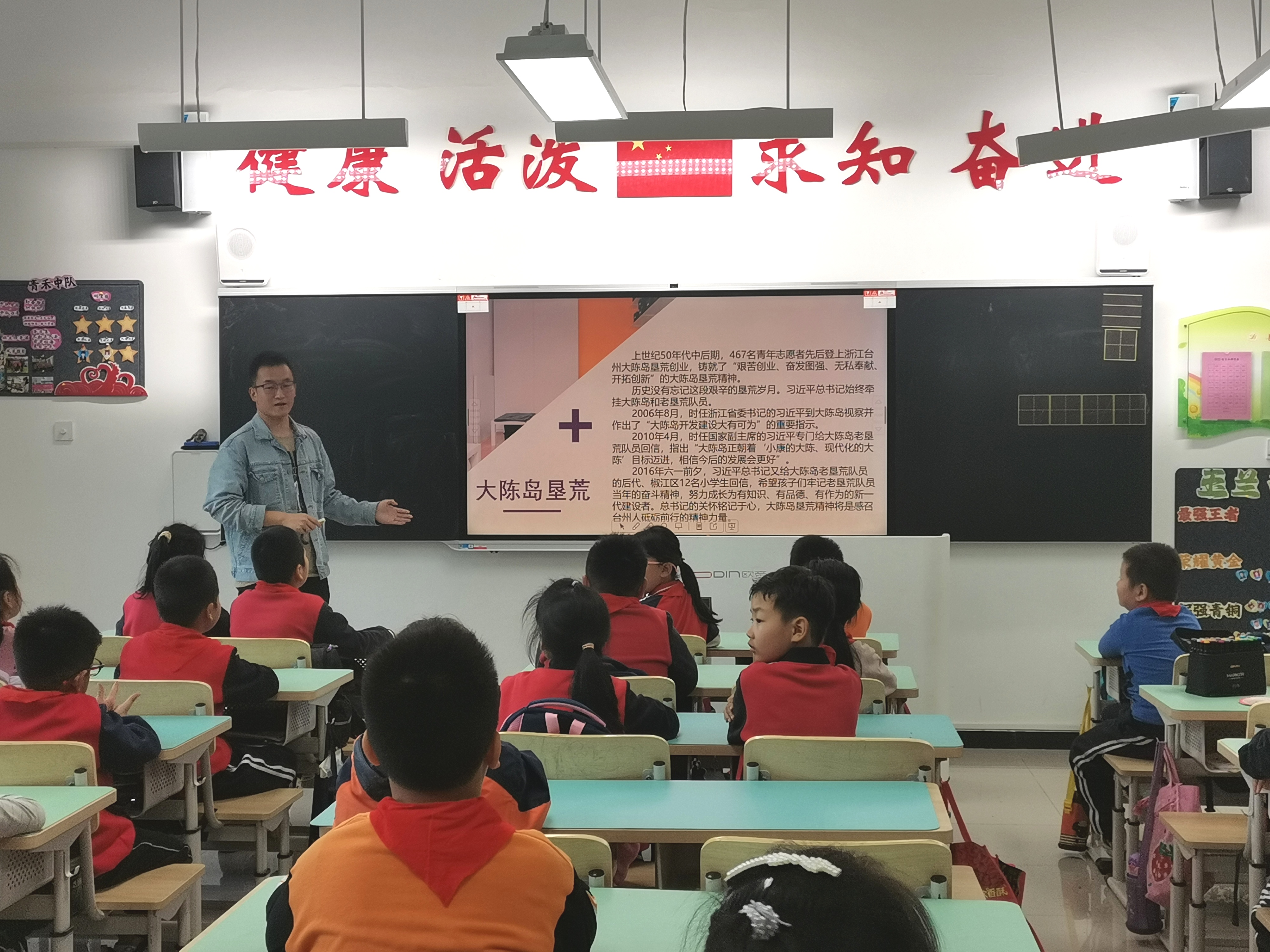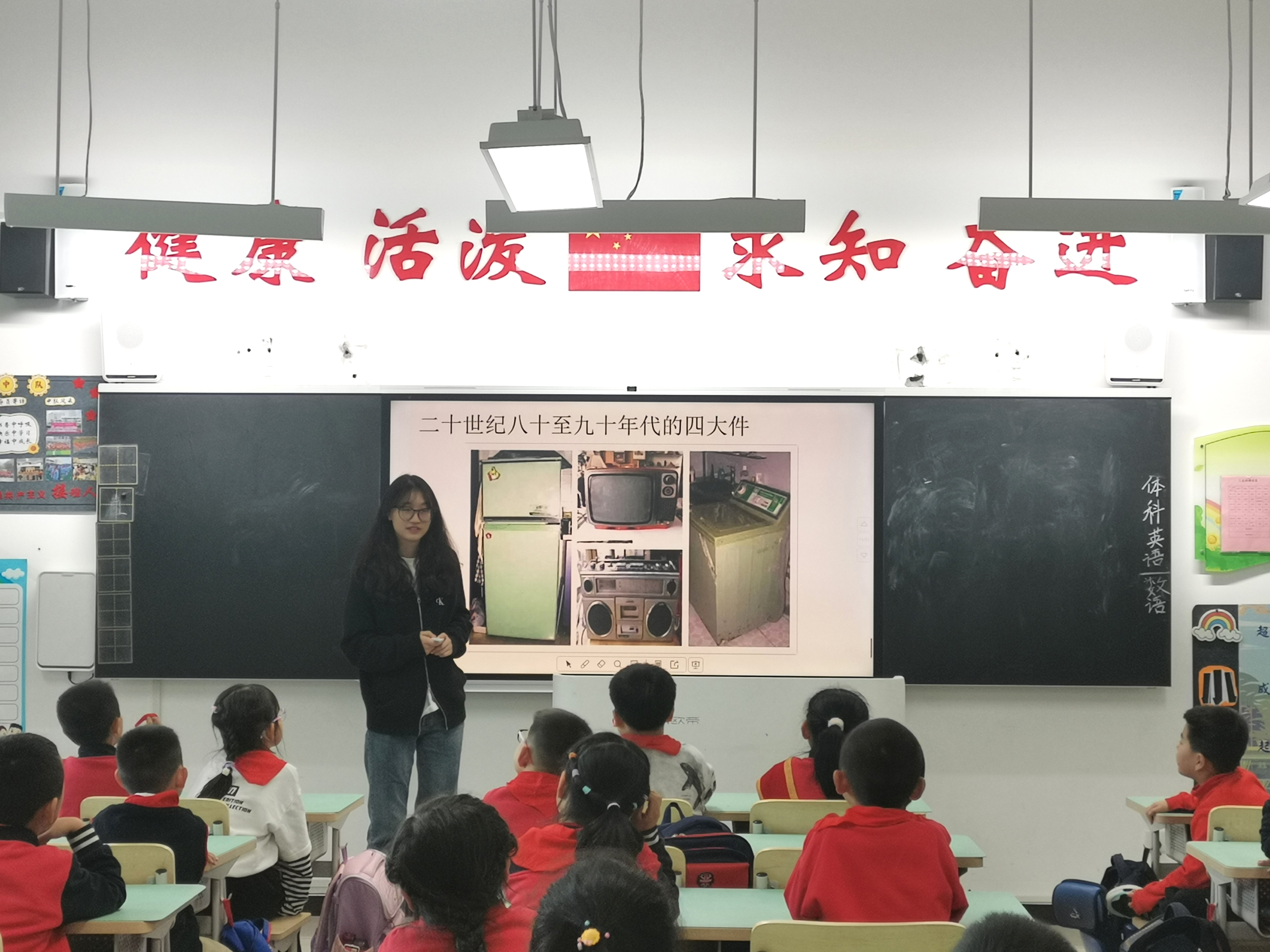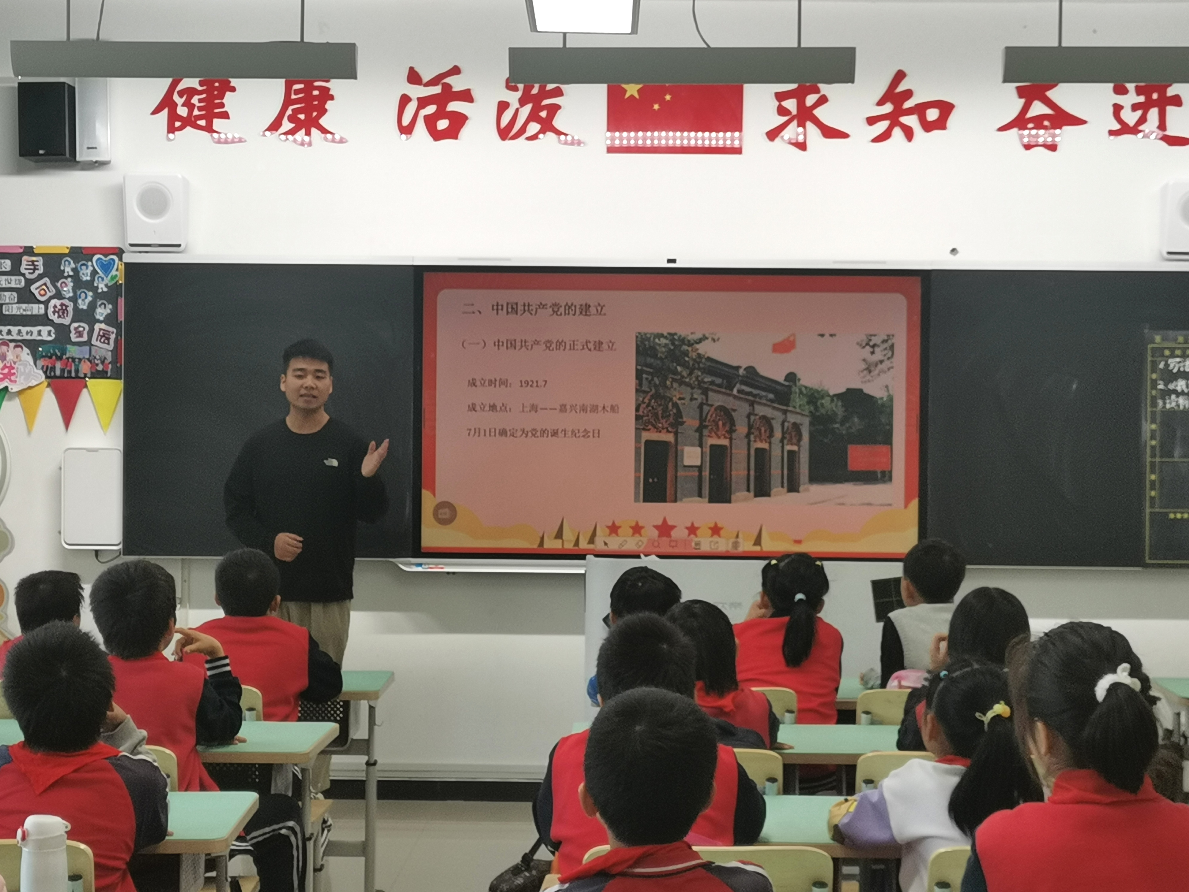 高美娟以《没有共产党就没有新中国》为主题,对中国共产党的成立和新中国的建立做了讲解,并帮助同学们理解了国旗和党旗的含义,更加深入地认识了党和国家的关系。