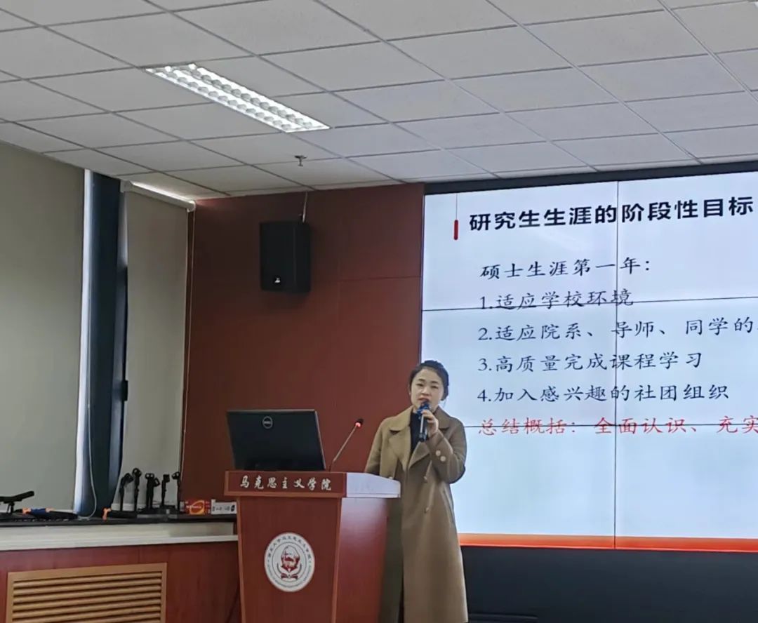 邵士博以“如何高质量度过研究生生涯”为主题,从四个方面与在座同学们进行了指导。首先,对自己有更清晰的认知。她谈到同学们要学会认识自己、分析自己,明确自己的优劣势,以便于更加清晰地规划学业生涯。其次,明确学习的阶段性目标和最终目的。她建议大家制定每一学年的阶段性目标、明确研究生生涯的最终目的,并为之努力、向着目标前进。再次,重点需要提升的几项技能。她希望,大家在研究生生涯不仅要潜心钻研、努力学习,也要全方面提升自身技能,使自己具备良好的个人素质。最后,调整情绪和心态的重要性。她强调,大家在面对挫折压力时候要学会悦纳自己,平衡内心情绪,努力调整好状态。在职业规划方面,她指出在研究生阶段要将学业规划和职业生涯规划相结合,在有限的三年时间中为人生职业做好规划并努力提升能力、增长才干,通过不断参与实践提升职业竞争力,以积极的心态面对职业选择和素质提升。