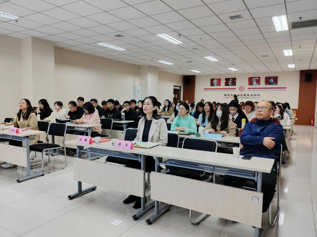 聘任仪式结束后,刘璇为大家作《国企党建工作方法与实务》的专题讲座,讲座围绕三个方面展开。首先,刘璇为大家分享了自身在个人方向上的选择,以她自身的经历鼓励同学们发掘并选择适合自身的就业方向。其次,刘璇针对国有企业的特点与种类,围绕西安西电高压开关有限责任公司2023年党建主要工作,从理论武装、企业治理、党建引领、基层党建、从严治党、问题查摆六方面介绍了工作的开展方式及亮点,让同学们对国有企业党建工作有更直观、更全面的了解,回应了大家普遍关注的党建工作做什么、如何做的问题。最后,刘璇分享了自己的联系方式,欢迎同学们与她进行进一步沟通交流。