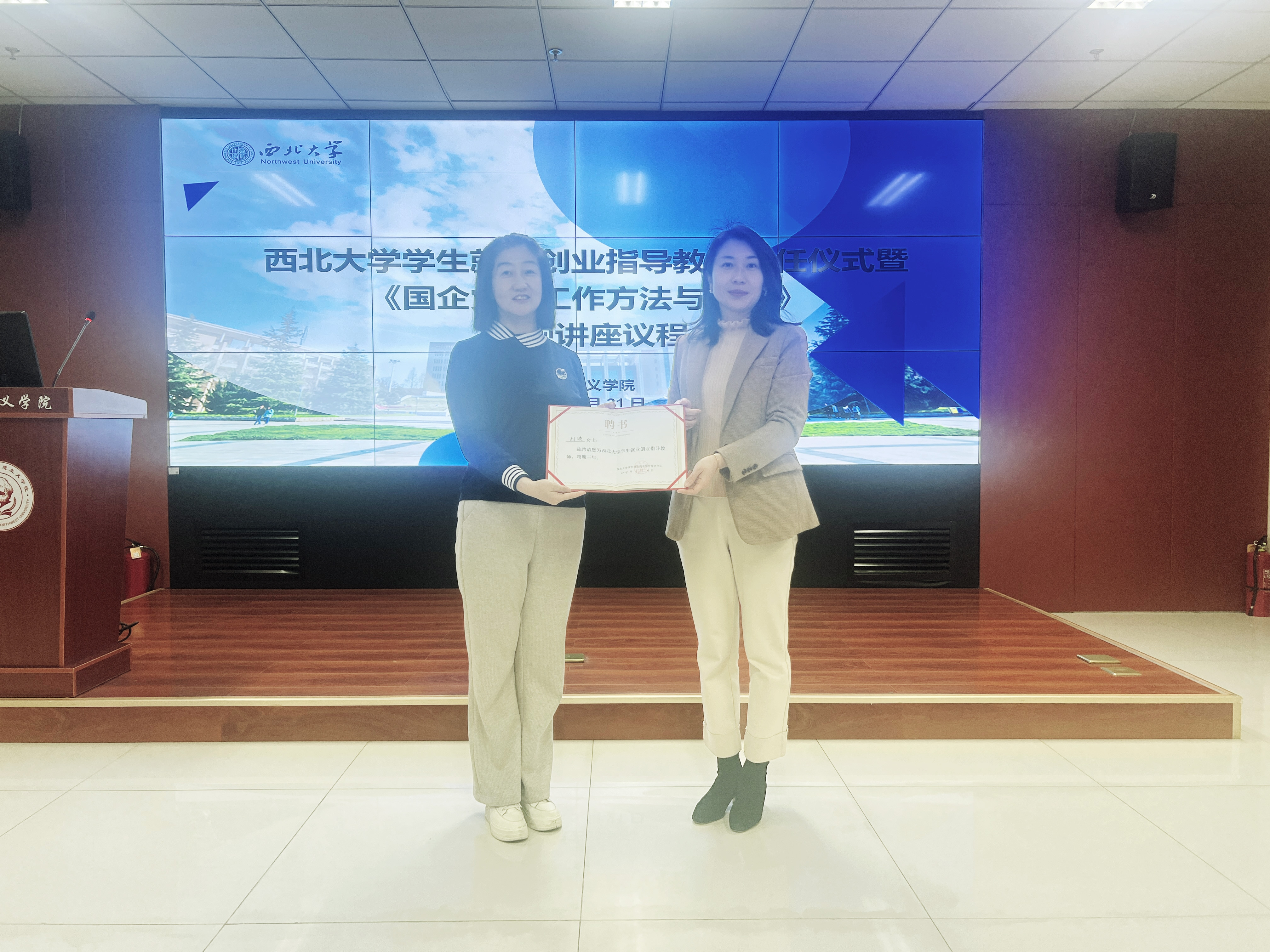 丁莹莹为刘璇颁发西北大学学生就业创业指导教师聘任证书。