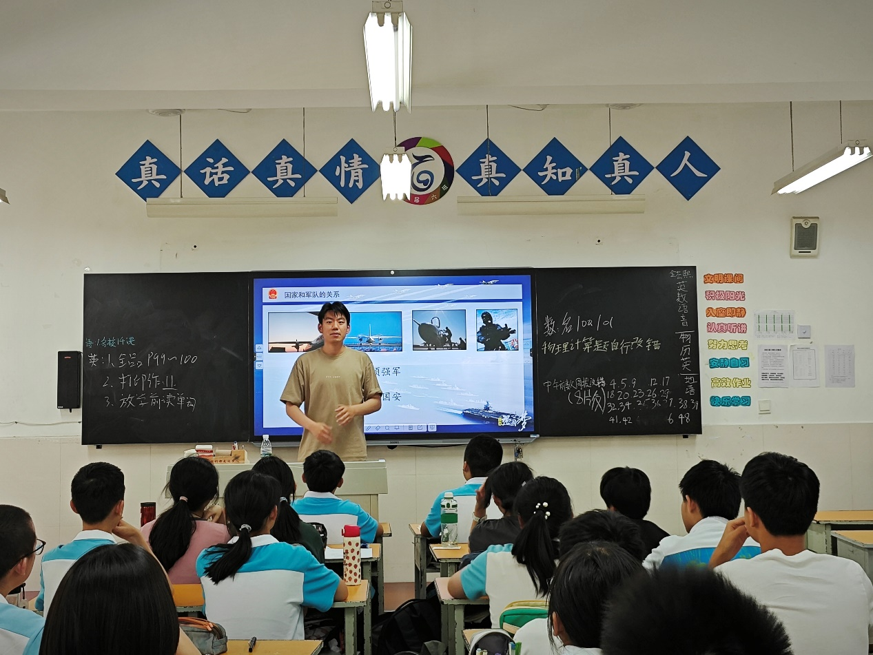 岳政远以《筑牢坚不可摧的钢铁长城》为题,讲述了我国推进国防和军队现代化建设战略安排“三步走”战略和习近平强军思想的主要内容,激发同学们的爱国之心、强国之志。
