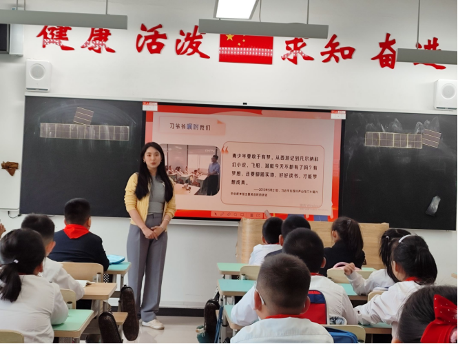 冯金香以《我有一个梦想》为题,通过分享袁隆平、屠呦呦、竺士杰等名人的梦想,引导同学们讲述自己的梦想,并鼓励同学们在坎坷的追梦路上大胆前进,永不言弃,做新时代的好少年。
