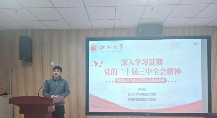 李旺盛以《学习贯彻党的二十届三中全会精神——构建高水平社会主义市场经济体制》为题,由历届三中全会的议题引入,讲述了党的二十届三中全会的核心要义、新时代以来我国取得的历史性成就,号召同学们要增强对党的政治认同、思想认同、理论认同、情感认同,在学习工作中增强历史主动精神,为中国式现代化建设挺膺担当。