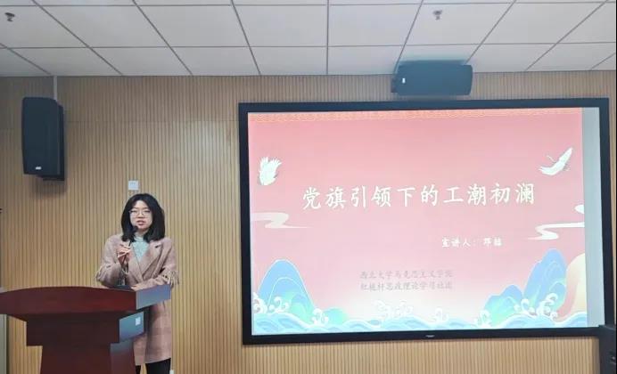 邓喆以《党旗引领下的工潮初澜》为题,首先介绍了中国工人阶级的基本概念,随后讲述了在中国共产党的带领下,中国工人阶级作为新兴的革命力量,英勇地开展了一系列影响深远的工人运动,从而突出强调了工人阶级在国家发展中的重要地位与卓越贡献,引导同学们深刻理解中国共产党的性质宗旨、初心使命,进一步端正入党动机。