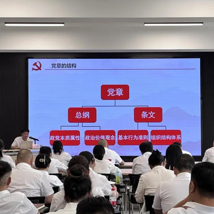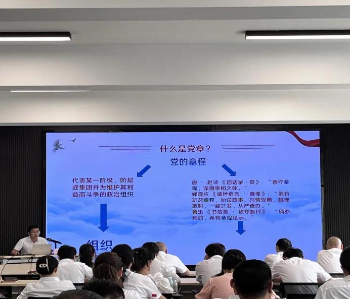 马万博以《学党章,强党性,做新时代优秀党员》为主题展开介绍,阐述党章重要地位与作用,梳理其历史渊源及发展历程,剖析二十大党章修改要点,并从历史、理论、实践逻辑角度对党章部分内容进行详细解读。