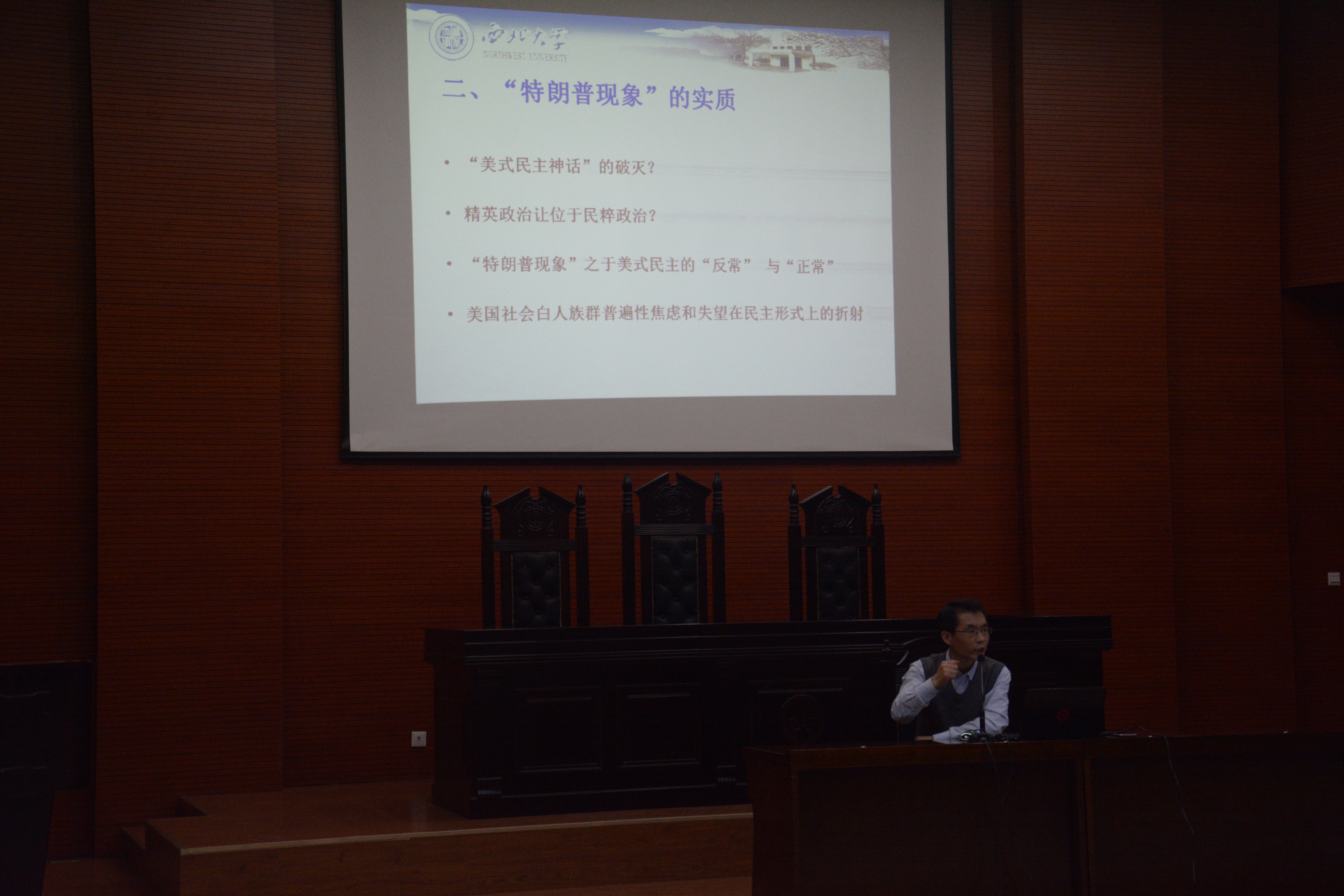 随后,教育部思政课教学能手、中国近现代史纲要课教研部苟昭赟同志为在座党员作了题为《“特朗普现象”中的美国民主》的专题讲座,对此次美国的总统大选以及美式民主作了透彻的分析。苟老师从美国的选举制度、“特朗普现象”的实质、美国及美式民主的理性审视等三方面深刻分析了此次美国大选的现象与本质,并结合我国实际情况进行了具体分析,证明中国特色社会主义政治制度是适合我国国情的好制度,他认为要坚持中国本位,坚持文明对话中的制度自信理论自信和道路自信,鼓励在座的党员同志要坚守信仰,时时事事发挥党员的先锋模范作用。