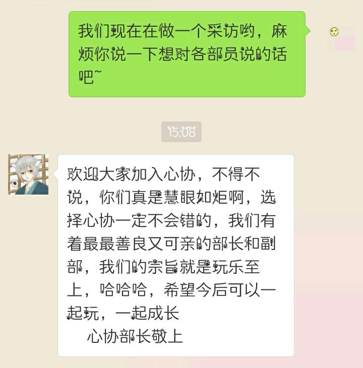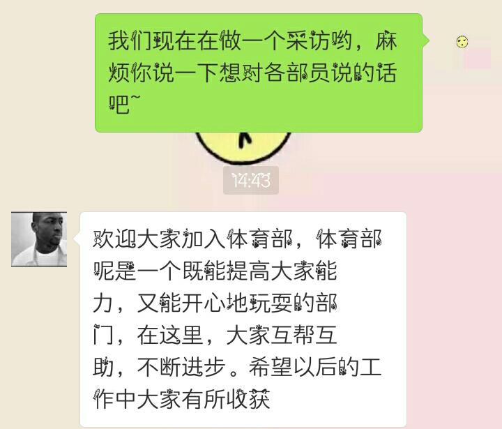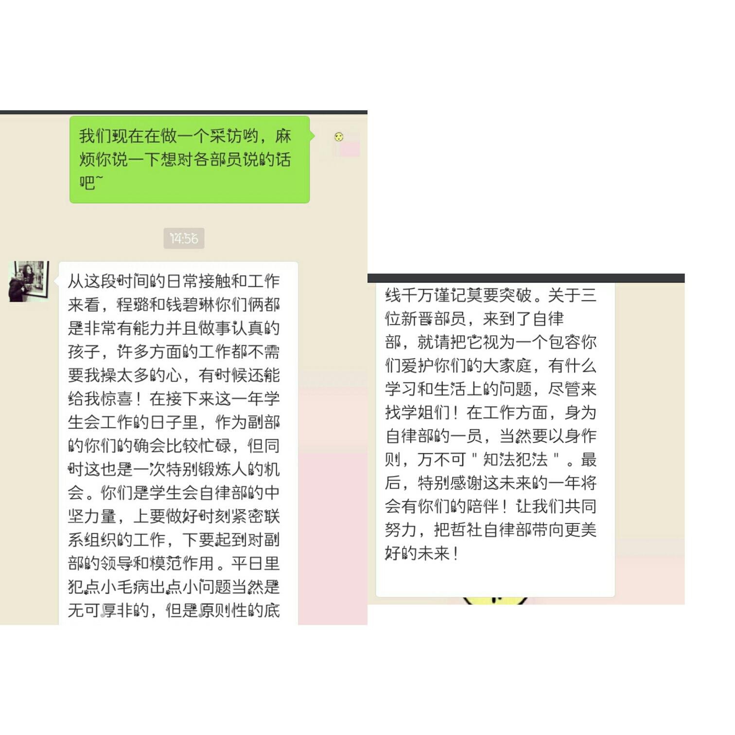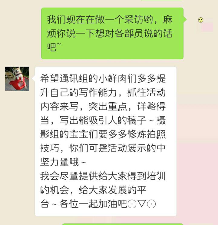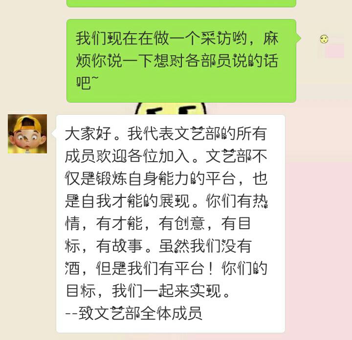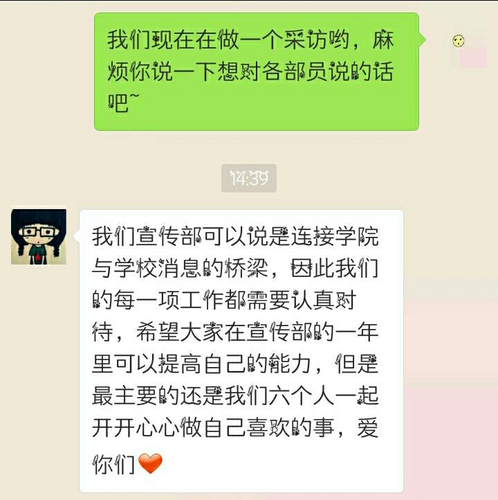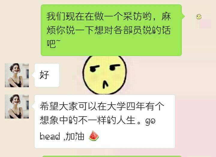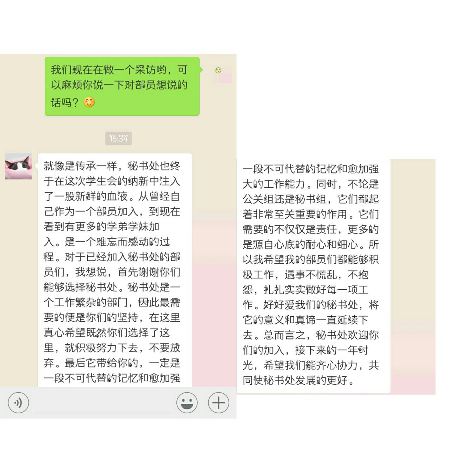 经过一段时间的准备与忙碌,学生会纳新终于落下帷幕,相信小鲜肉们都已经加入了自己想要加入的部门并且都和你们的部长大大见过面畅想过未来啦!现在,我来给你们送部长大大想对你们说的悄悄话啦~这次可就不再是干巴巴的文字啦,所有的采访都是通过微信来完成的,部长大大想对你们说的话全部都是截图下来的哟,有图有真相!