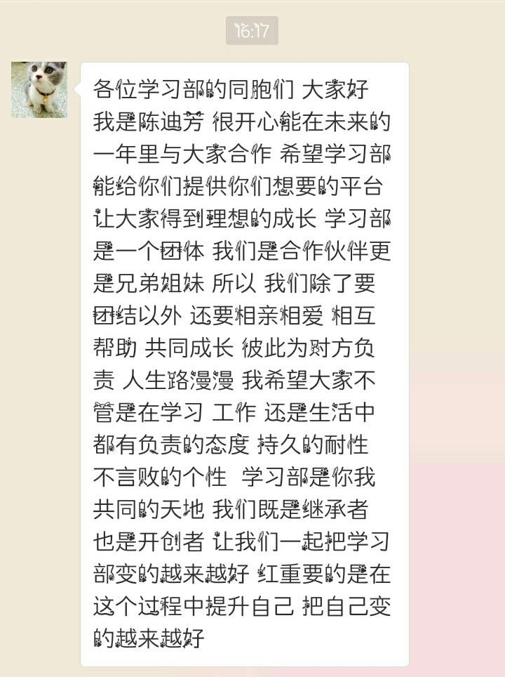 Then,你们将看到的是学习部的陈迪芳学姐的寄语。陈迪芳学姐可是学霸哟,我觉得有什么问题请教学姐学习部的小伙伴可是近水楼台先得月。