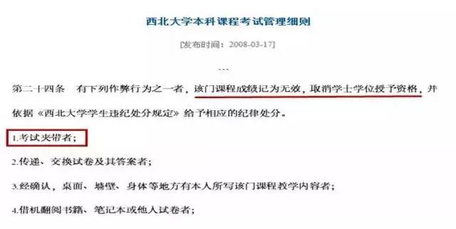 案例一2014级本科生高**夹带,根据《西北大学本科课程考试管理细则》(校发[2005]教字24号)第二十四条第一款及《西北大学学士学位授予工作细则》(校发[2006]教字31号)第八条第二款之规定,学生高**该门课程成绩记为无效, 取消学士学位授予资格。