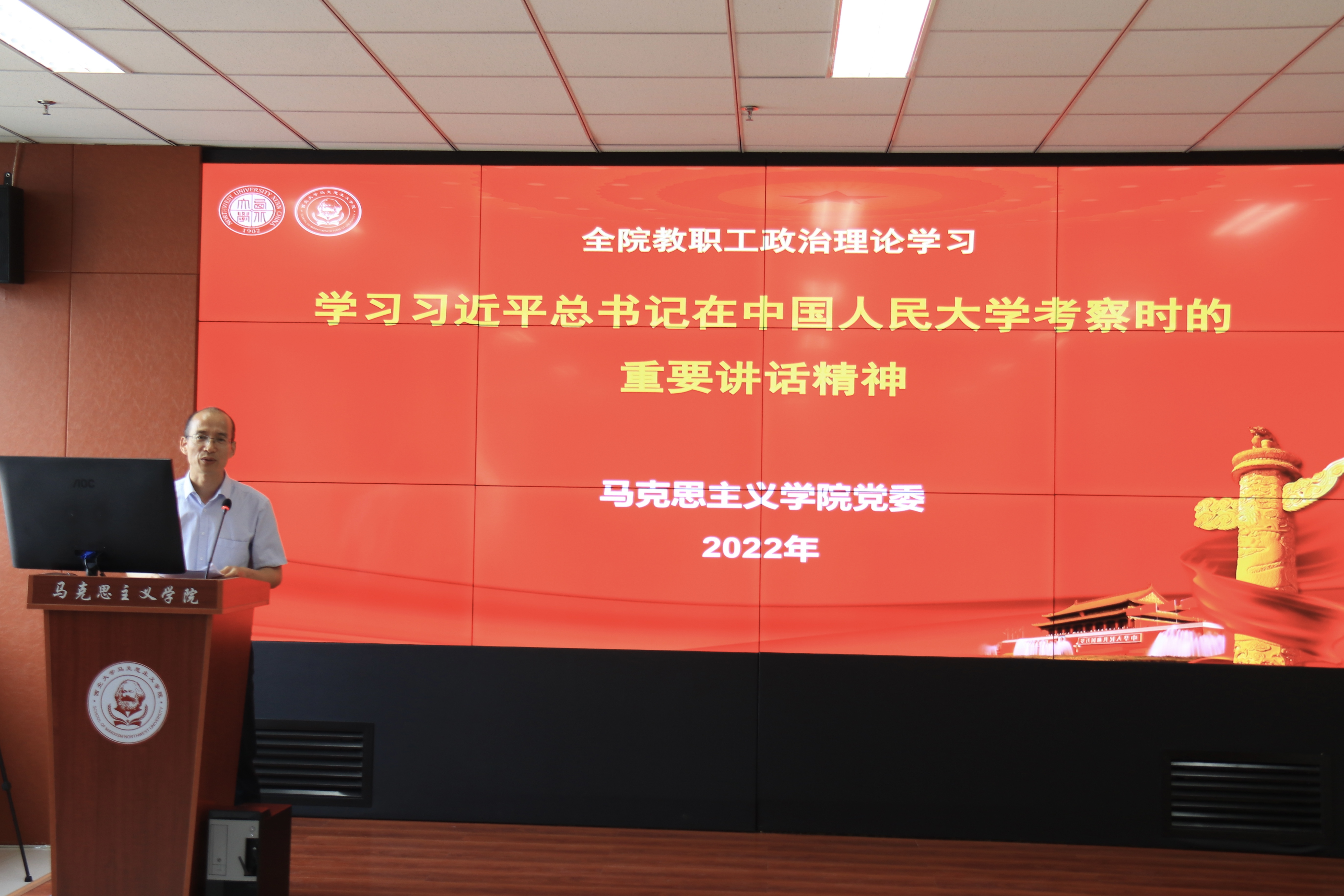 院党委书记韩凯峰带领全体教师深入学习了习近平总书记在中国人民大学考察时的重要讲话精神。他要求,学院各党支部、院团委要组织全院党员、团员和师生认真学习贯彻习近平总书记在中国人民大学考察时的重要讲话精神。他强调,要把学习贯彻此次重要讲话精神与习近平总书记在全国高校思想政治工作会议上的重要讲话精神、在学校思想政治理论课教师座谈会的重要讲话精神相结合,深入学习领会贯彻习近平总书记对思政课建设、思政课教师队伍建设等提出的要求和期望。要把学习贯彻此次重要讲话精神与加强新时代马克思主义学院建设相结合,按照党中央要求,着力建好建强马克思主义学院主阵地,坚持“马院姓马,在马言马”的鲜明导向和办学原则;进一步凝练学科方向、突出学科特色、发挥学科优势,不断推进学科高质量发展;着力创新思政课教学方式方法,切实提高思政课教学质量,切实把立德树人、铸魂育人落到实处。要把学习贯彻此次重要讲话精神与加强教师思想政治教育和师德师风建设相结合,全院教师要努力做到政治强、情怀深、思维新、视野广、自律严、人格正,切实用高尚的人格感染学生,用真理的力量感召学生,以深厚的理论功底赢得学生,自觉做为学为人的表率,做让学生喜爱的人;努力做“经师”和“人师”的统一者,立志做学生为学、为事、为人的大先生。