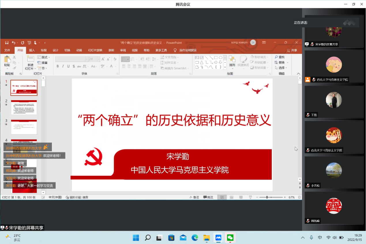 9月15日晚,宋学勤教授应邀做客我校“侯外庐学术讲座”,为师生作了题为“‘两个确立’的历史依据与历史意义”的精彩报告。报告由学院常务副院长王强主持,学院党委中心组成员和学院师生、部分院系2021级本科生在“习近平新时代中国特色社会主义思想概论”课堂上在线参加了本次报告会。
